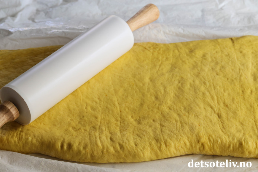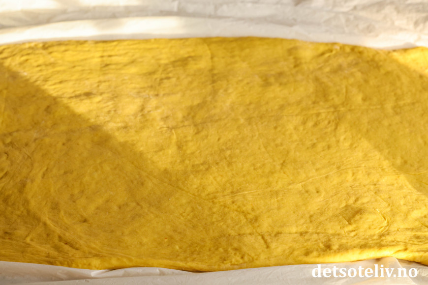 Kjevle ut deigen til en kjempestor, avlang leiv (ca. 60 x 40 cm). Jeg brukte her en stor plastpose som underlag. Alternativt kan du dele deigen i to og kjevle ut hver del for seg (to leiver som måler ca. 30 x 40 cm).