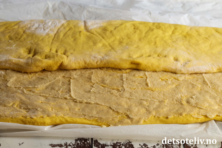Brett så 1/3 av deigen over slik at den dekker 2/3 av deigen. Brett så over den siste 1/3 av deigen. Du har nå en leiv med 3 lag. Kjevle den brettede deigen forsiktig litt utover så den blir lavere og jevn i kantene.