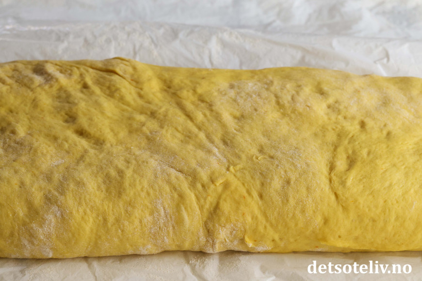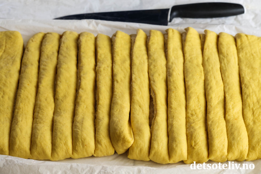 Ta hver lengde og legg på bakebordet med snittflaten vendende opp.