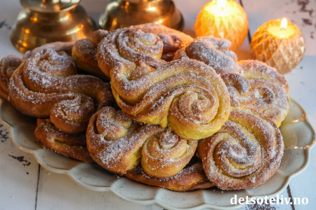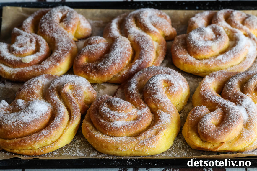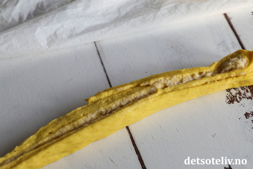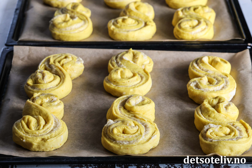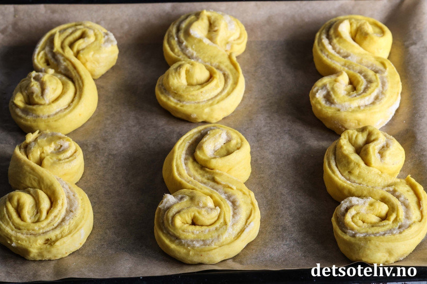Skjær leiven i lengder som er ca. 2 cm brede. Ta hver lengde og legg på bakebordet med snittflaten vendende opp. Rull inn begge sidene i hver sin retning slik at du får boller med S-fasong. Legg S-ene på bakepapirdekkede stekeplater. La de etterheve i ca. 30 minutter.