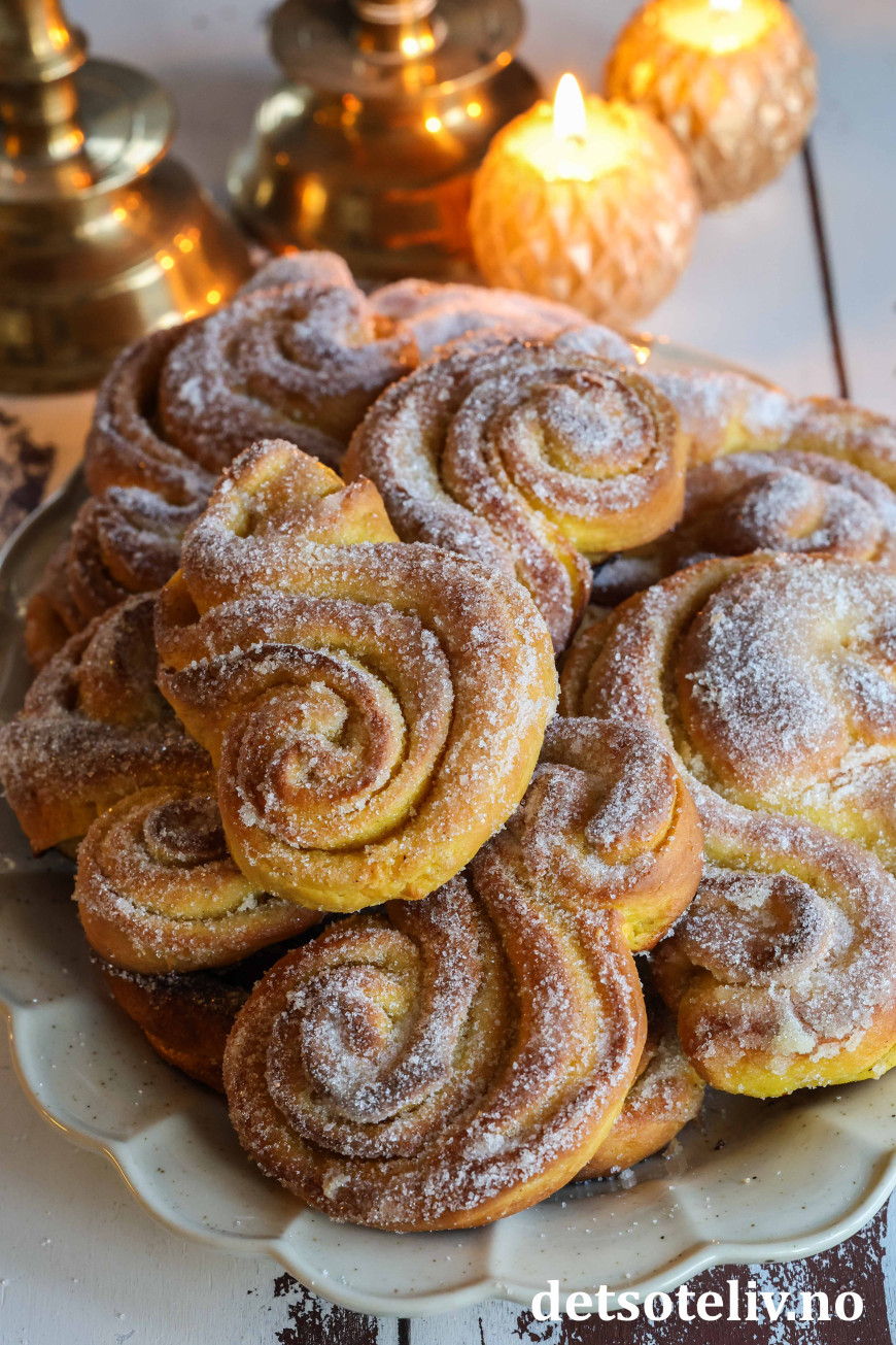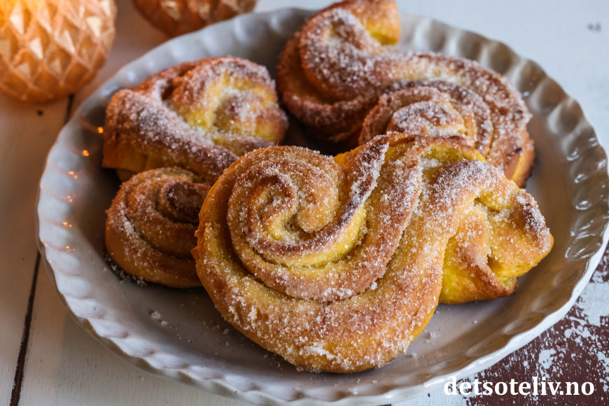 Jeg brukte deigen til Verdens beste Lussekatter, som gir nydelige, myke boller. Deigen kjevles ut, smøres med vaniljesmørkrem og brettes deretter i tre. Så skjæres den brettede deigleiven i lengder som formes til S'er. På denne måten får du vakre Lussekatter med flere tynne lag! 🤩 Pensle Lussekattene med smeltet smør og dypp dem i sukker rett etter at bollene er tatt ut av ovnen.
