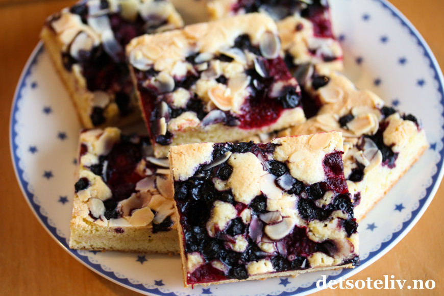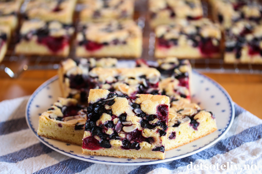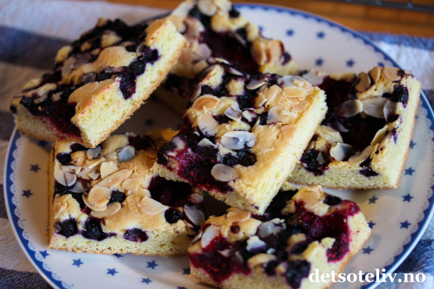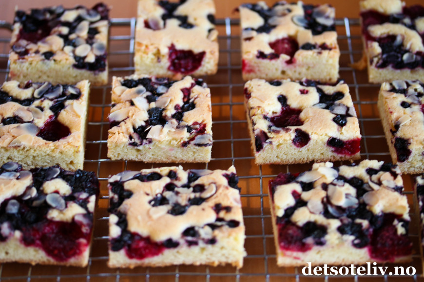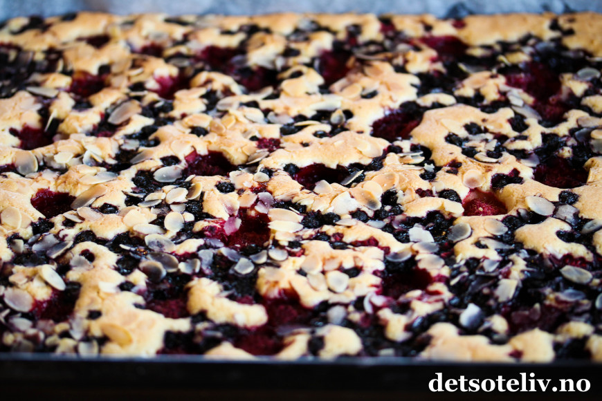 Bare legg på noen blåbær og bringebær og dryss over mandelflak, så har du en super deilig sommerkake som rekker til mange. Kakestykkene er kjempefine å fryse.