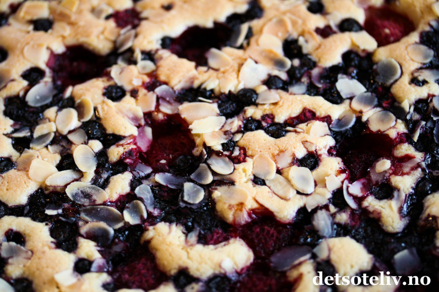 ♥ Jeg brukte her en blanding av blåbær og bringebær, men du kan bruke de bærene du liker best. Jeg brukte friske bær, men du kan godt bruke frosne også (frosne bær trenger ikke å tines før du strør dem over kaken, for de tiner raskt når kaken steker.