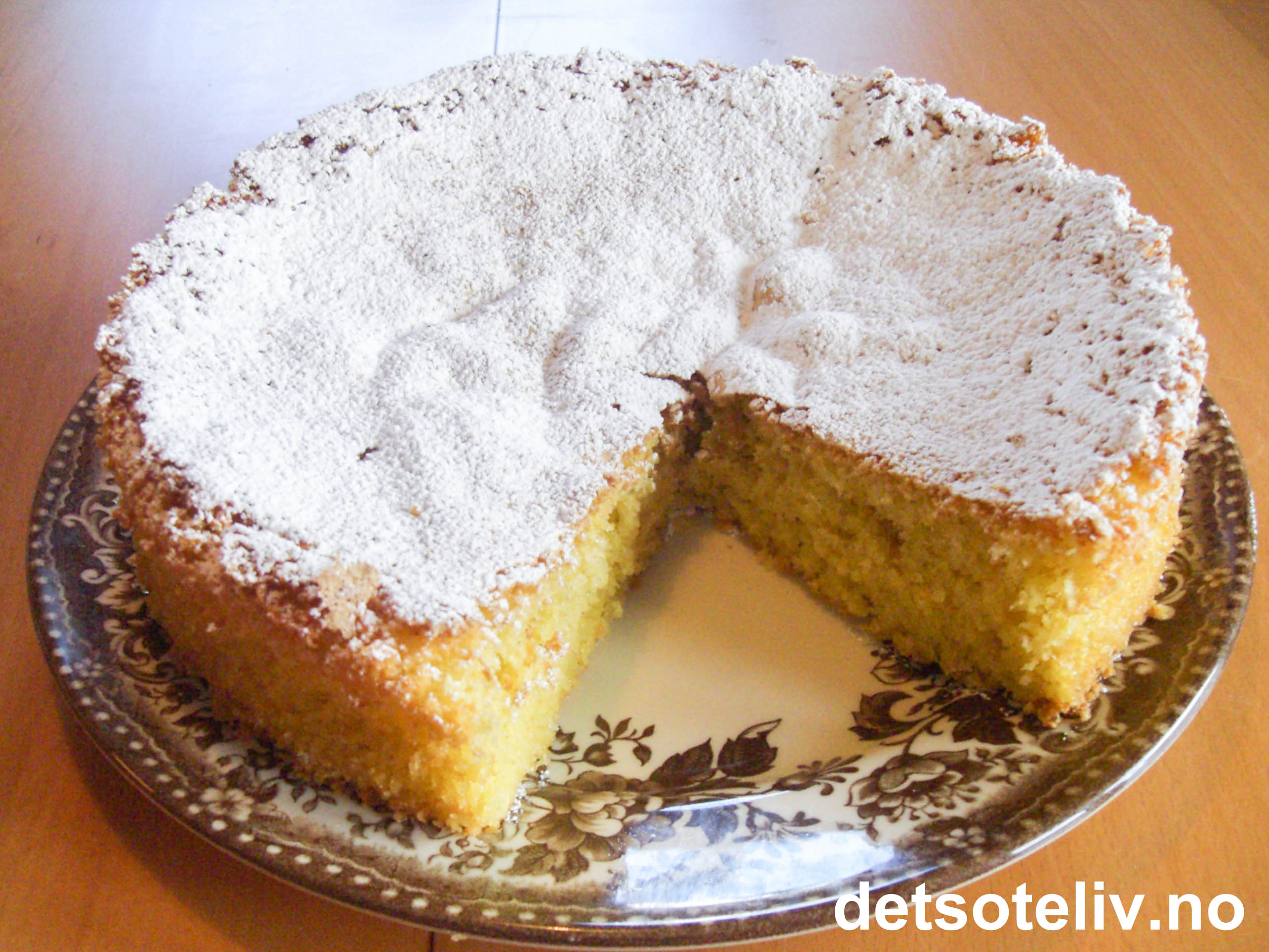 Hell deigen i en rund kakeform (22 cm i diameter) med bakepapir i bunnen. Stek kaken på rist midt i ovnen ved 175°C i 35-40 min. Avkjøl kaken helt i formen. Løsne kaken fra formen med en skarp kniv. Ta den ut av formen og fjern bakepapiret. Sett kaken på et passende fat og sikt melis over kaken før servering.