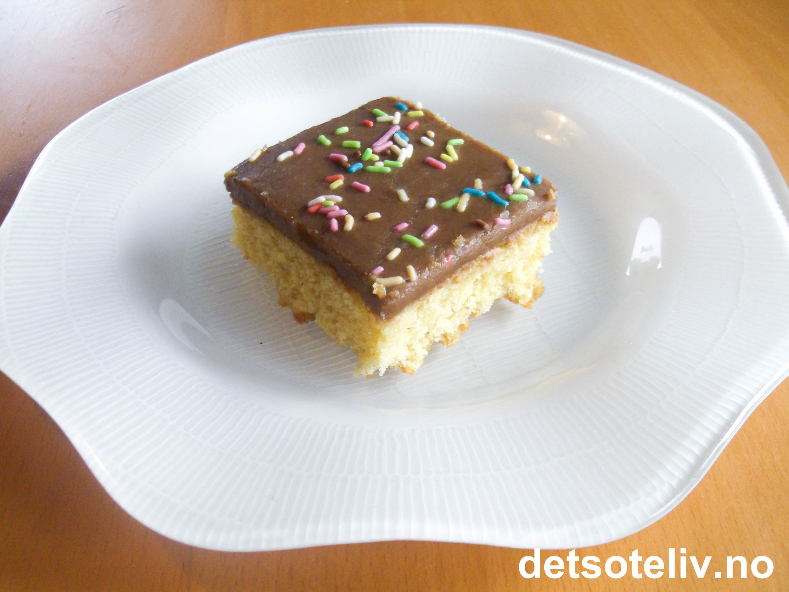 Bre deigen utover i en stor, bakepapirkledd langpanne (ca 30x40 cm). Stek kaken midt i ovnen ved 180°C i 15 min. Avkjøl kaken i langpannen. Hvelv den så ut og dra av bakepapiret.