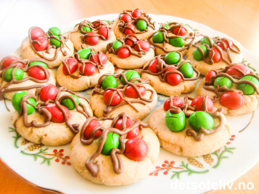 Form deigen til valnøttstore, runde kuler som legges på bakepapirdekkede stekeplater og trykkes litt flate. Trykk 4 stk M-sjokolader ned i hver kake. Stek kakene midt i ovnen ved 180°C i 15-20 min, eller til de er lyst gyldne. Avkjøl helt.