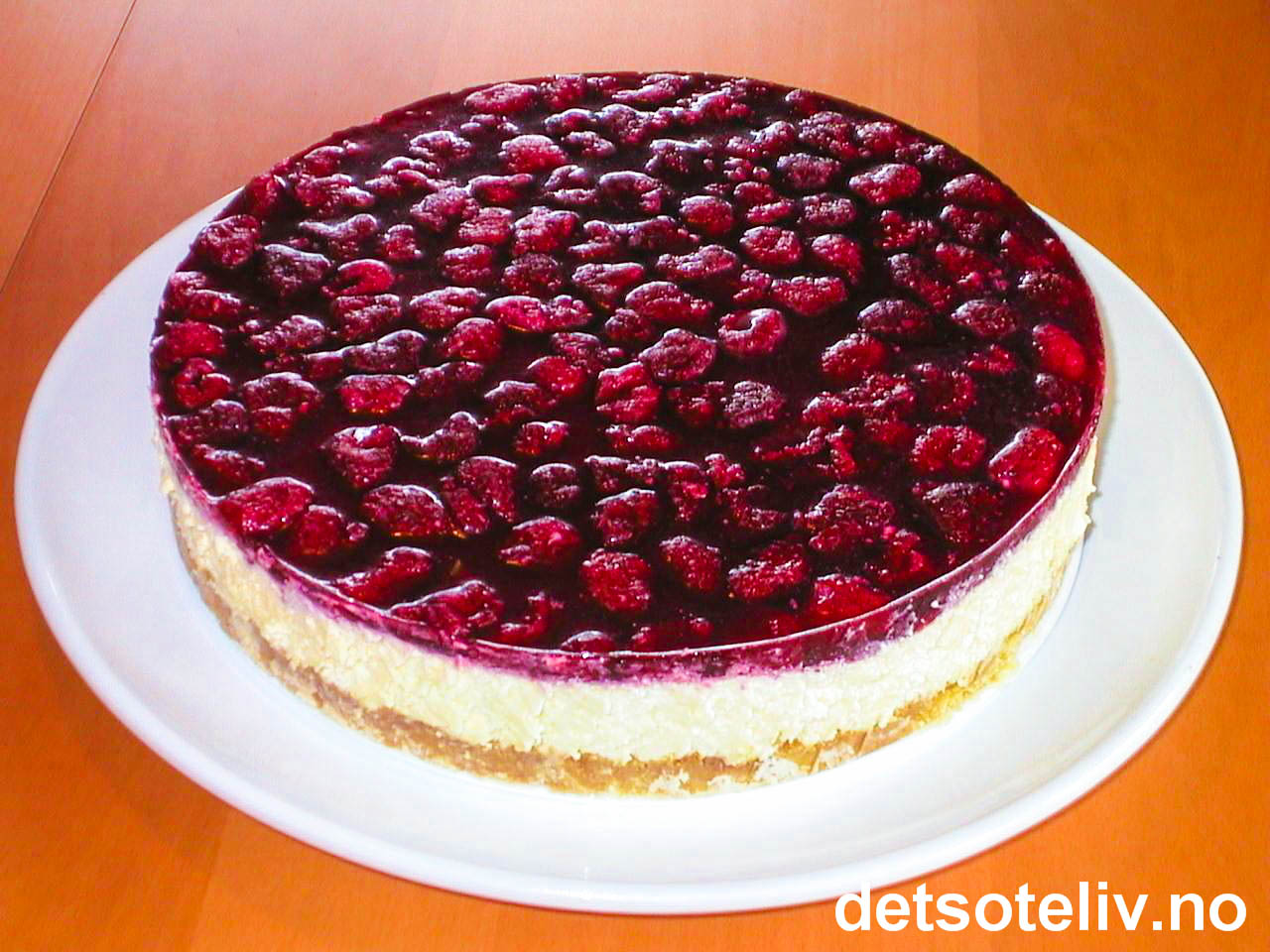 Tin bringebærene (enten i en liten kjele eller i mikro). Sil vekk saften til bruk i geléen og legg bringebærene oppå fromasjen. Mål opp 2,5 dl bringebærsaft og vann. Gi dette et oppkok. Rør i gelépulveret til det er helt oppløst. Avkjøl til geléen er kald, men ikke stivnet. Hell geléen forsiktig over bringebærene. Sett formen tilbake i kjøleskapet til geléen har stivnet.