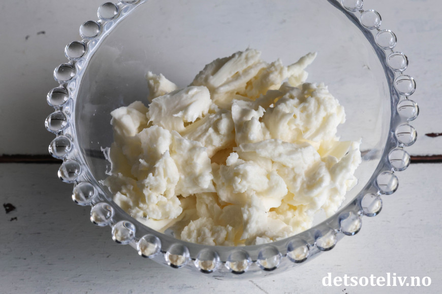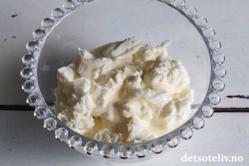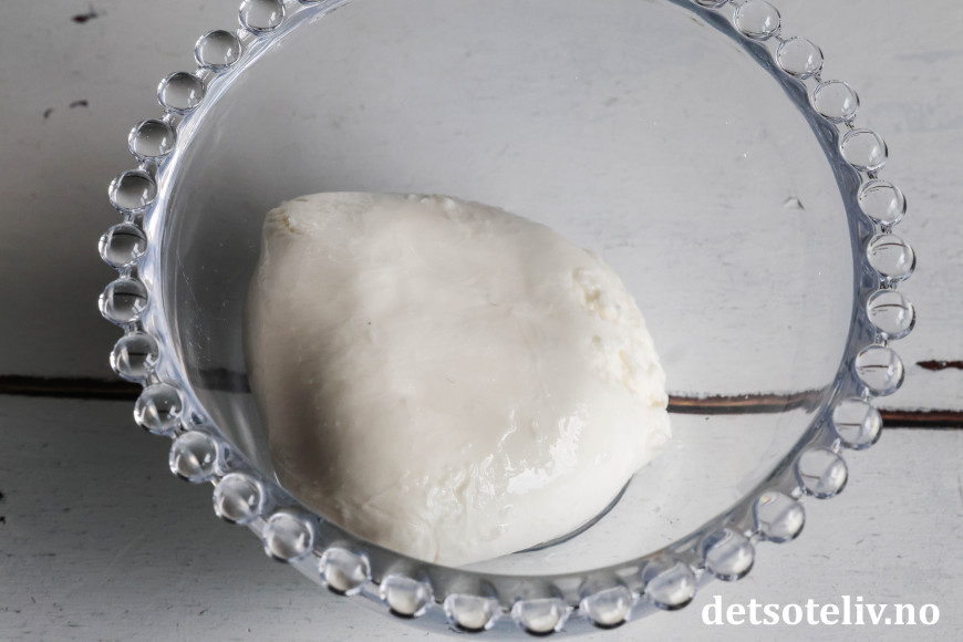 Hell av vannet fra mozzarellaen. Riv osten i biter og ha i en skål. Tilsett kremfløten og flaksalt. Bland godt med en gaffel.