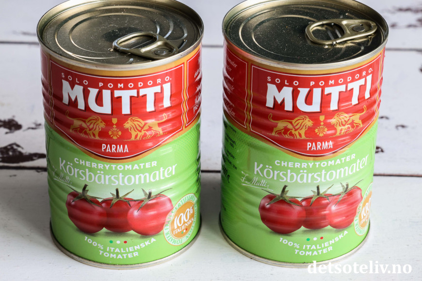 Tilsett hermetiske cherrytomater og frisk basilikum.
