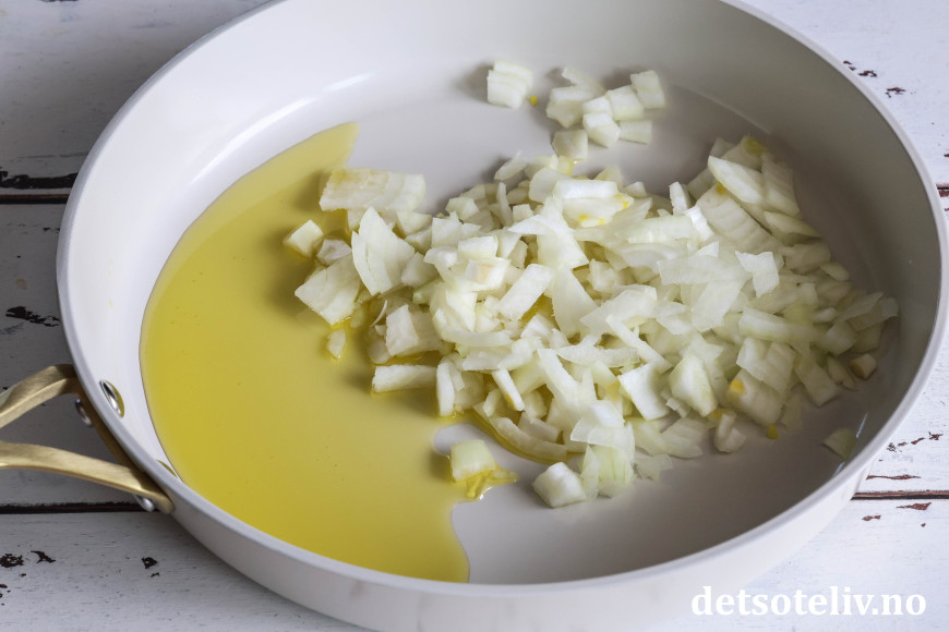 Kutt opp løk og ha i en dyp stekepanne sammen med olivenolje. La løken steke på middels varme til den er gyllen og myk.