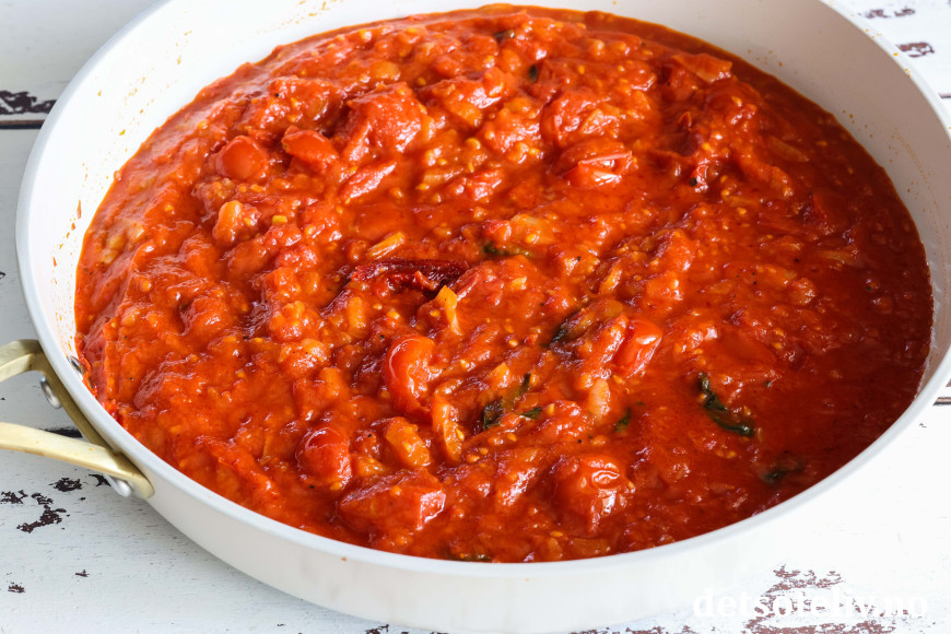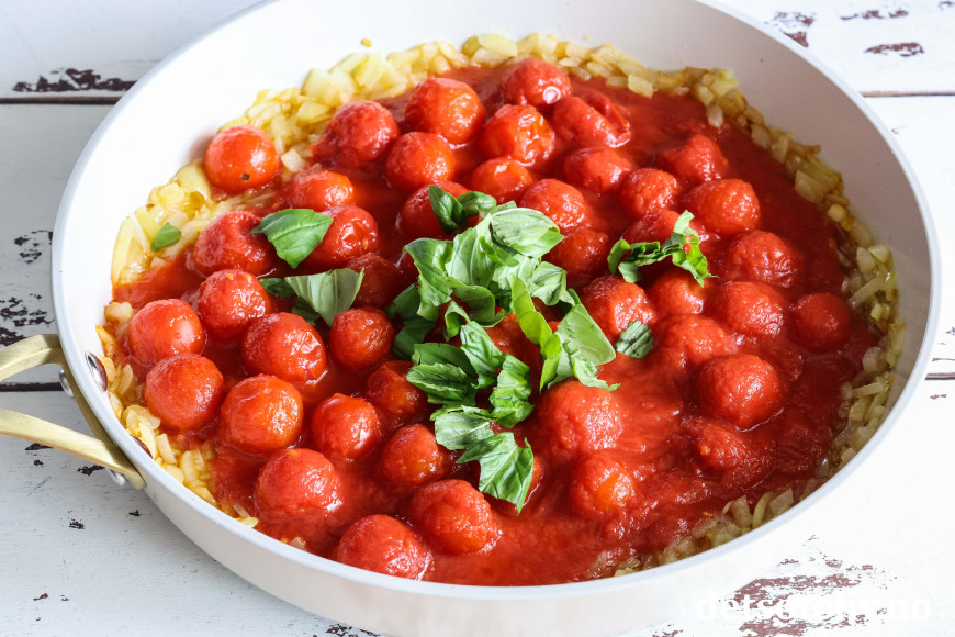 ♥ Når man lager Salsa alla napoletana er det essensielt at man bruker hermetiske tomater av god kvalitet. Bruk San Marzano-tomater eller cherrytomater som jeg har brukt her.
