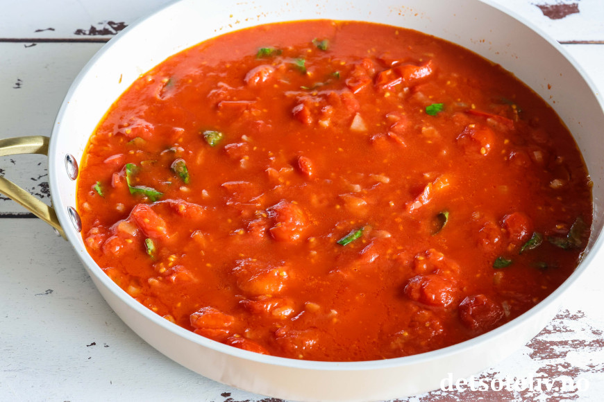 La sausen småkoke i ca. 15 minutter. Tomatsausen skal bli tykk og chunky.
