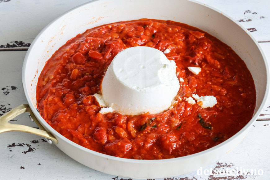 Ha ricotta i resten av tomatsausen. Smak til med kvernet salt og pepper.