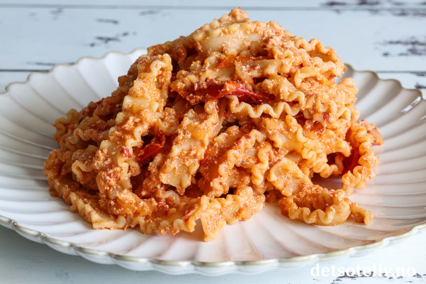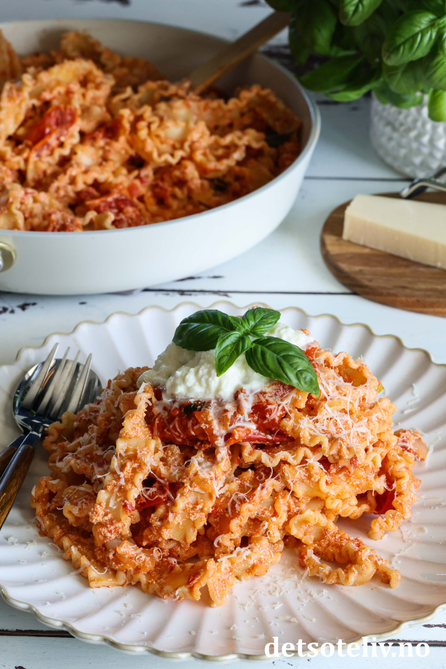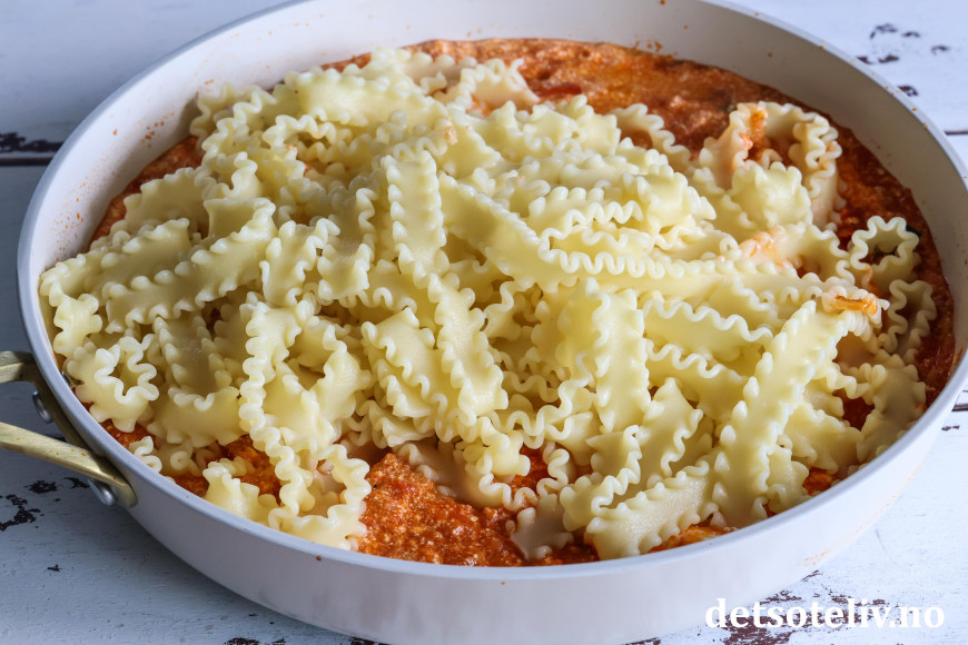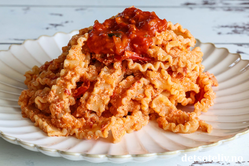 Vend så i den kokte pastaen og ca. 1 dl av pastavannet (juster med mengde pastavann til passe konsistens på sausen). La pastaen småkoke sammen med pastasausen et lite minutt, slik at pastaen trekker til seg smaken av den gode tomatsausen.