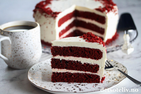 Oppskriften er en KING SIZE versjon av den klassiske, amerikanske, røde fløyelskaken "Red Velvet Cake". Magnolia Bakery i New York ble verdensberømt etter å ha vært et av stamstedene til jentene i TV-serien Sex og singelliv, og det er ikke uvanlig med meterlange køer på gaten utenfor bakeriet. Jeg har vært der selv, og holdt på å dåne da jeg så alle de fantastiske, overdådige kakene!