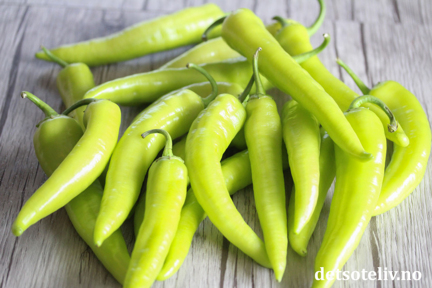 ♥ Lysegrønne, milde paprika (kalles gjerne bananpaprika ("Banana Peppers" på engelsk) pga fasongen) er vanskelig å få tak i her i Norge fant jeg ut. Hvorfor?? Håper norske butikker kan starte med å ta inn dette. Jeg måtte til utenlandsk grønnsaksbutikk på Grønland i Oslo for å få kjøpt disse paprikaene (da kjøpte jeg med meg mange! ). Jeg hadde ikke smakt slike paprika før, og likte dem veldig godt. Bananpaprika er lysegrønne, avlange og litt krokete og er helt milde på smak (selv om de ligner på chili).