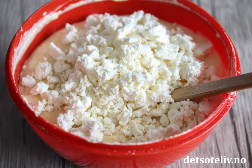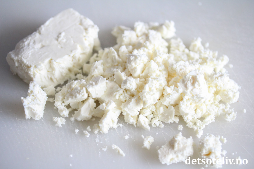 Smuldre opp fetaosten og vend forsiktig inn i deigen.