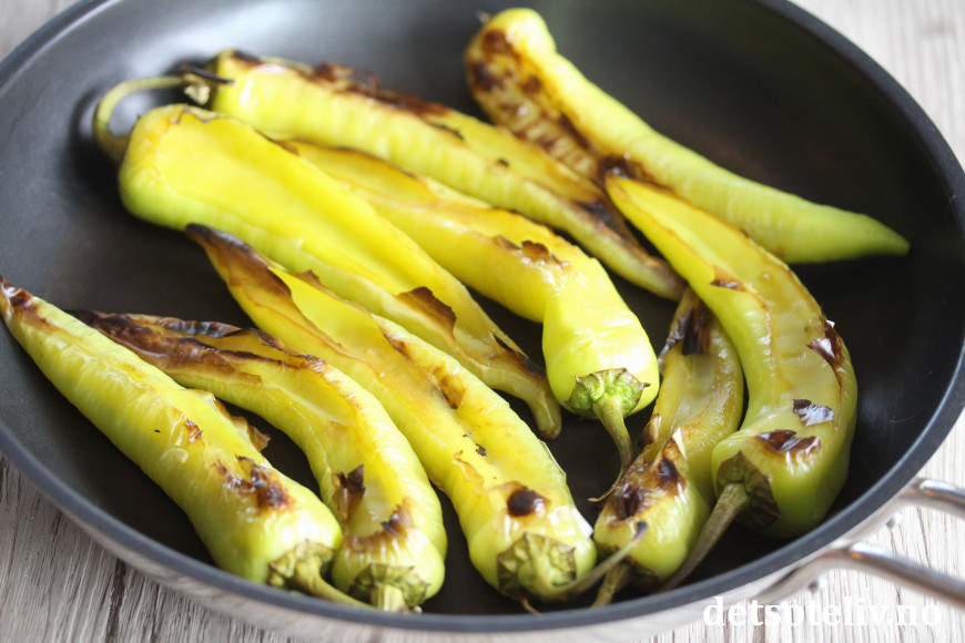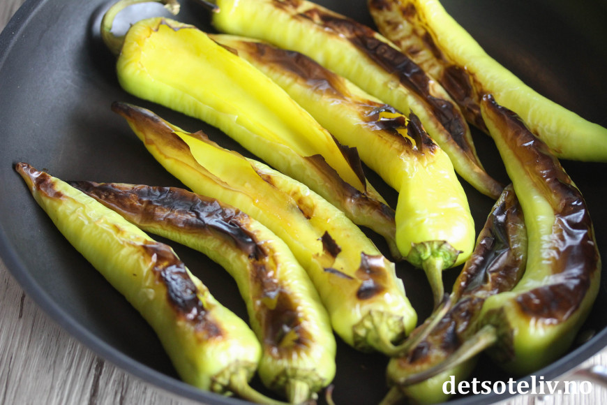 Start med å legge 8-10 bananpaprika i en tørr stekepanne. Varm opp til du ser at paprikaene får små svidde partier (det smeller litt i paprikaene når du varmer dem opp slik). Vend litt rundt på paprikaene slik at de får farge på begge sider.