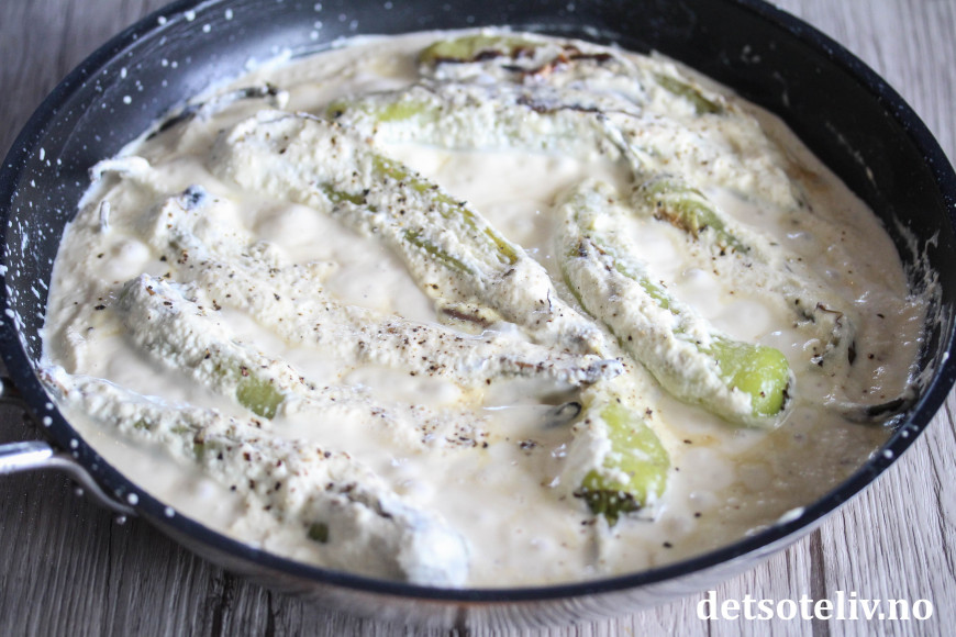 Lysegrønne bananpaprika stekt i rømme er klassisk tilbehør: