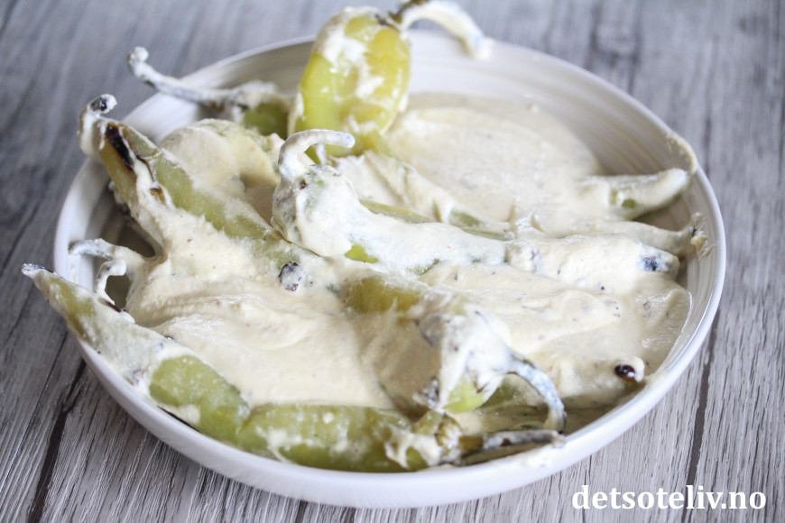Jeg spurte Miranda hva som er typisk tilbehør, og fikk da tips om lysegrønne, milde paprika som stekes møre sammen med rømme. Dette måtte jeg også teste, så du får begge oppskriftene i dette innlegget (og se innlegget HER). Utrolig godt både sammen og hver for seg!