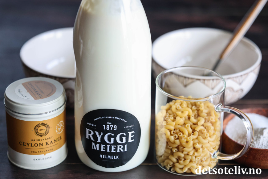 Tilsett makaroni, sukker, vaniljesukker og kanel.