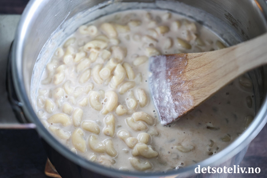 Makaronisuppen er ferdig kokt når makaronien er helt myk og suppen har fått en litt fyldigere konsistens.