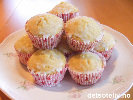 Glaser de avkjølte muffinsene med et tynt lag glasur som er laget med melis og litt sitronsaft.