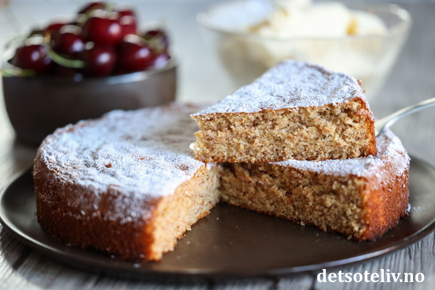 Hell deigen i en rund kakeform (24 cm i diameter) med bakepapir i bunnen. Stek på nederste rille i ovnen ved 175°C i ca. 25 - 30 minutter. Avkjøl kaken helt i formen. Løsne kaken fra formen ved å skjære forsiktig langsmed kanten av formen med en skarp kniv. Ta kaken ut av formen og fjern bakepapiret. Sett kaken på et passende fat.