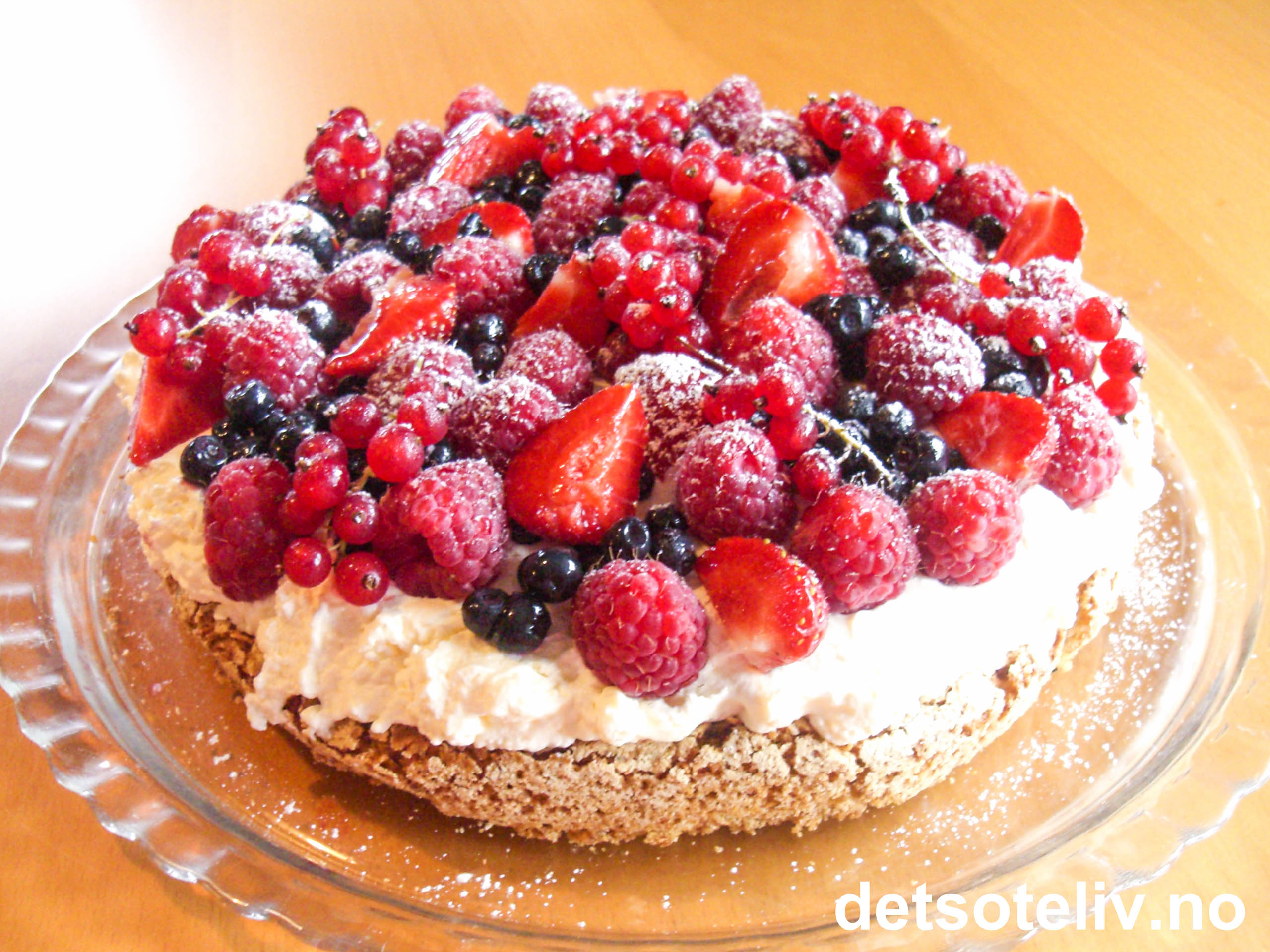 Legg kaken på et kakefat. Pisk kremfløten til krem og smak til med vaniljesukker. Dekk kaken med krem og pynt med friske bær. Sikt over litt melis før servering.