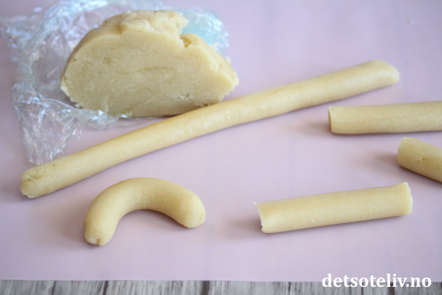 ♥ Ekte marsipan er marsipan med ekstra høyt mandelinnhold (se etter lilla rull fra Odense). Du må bruke ekte marsipan i deigen for at kakene skal holde fasongen under stekingen. Figurmarsipan smelter ved steking og gir flate kaker.