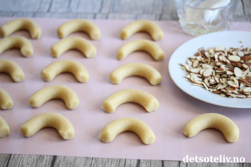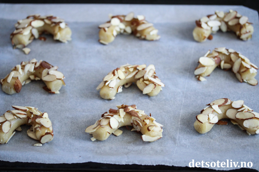 Del deigen i 16 jevnstore deler. Ha eggehvite i en skål og mandelflak i en annen. Form hver deigbit til ruller som er litt tynnere i endene og bøy dem deretter slik at de får fasong som horn. Pensle over hornene med eggehvite og press dem ned i skålen med mandelflak slik at mandelflakene fester seg til kakene. Legg dem deretter på bakepapirdekkede stekeplater. Stek kakene midt i ovnen ved 175 °C i 10–15 minutter. Avkjøl kakene til de er helt kalde.