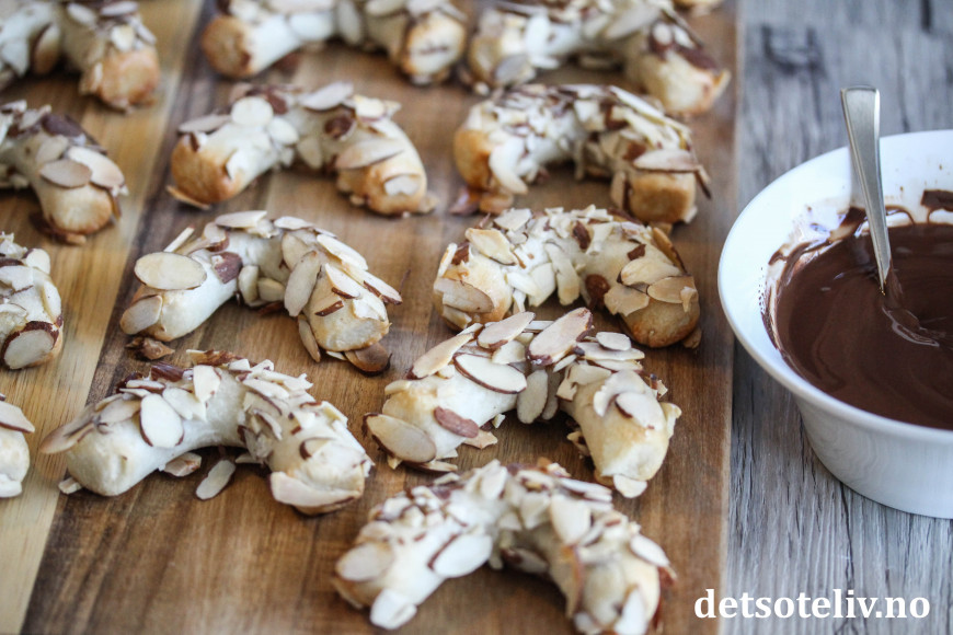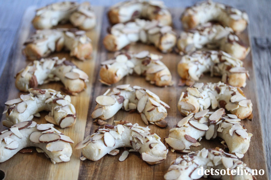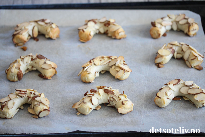 Denne oppskriften på Mandelhorn er opprinnelig tysk ("Mandelhörnchen"), og har en myk marsipankonsistens.