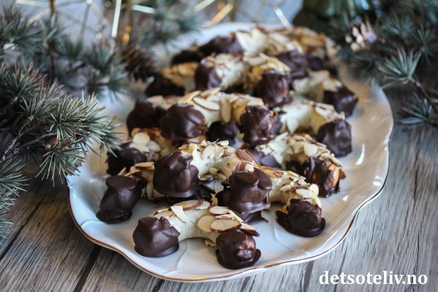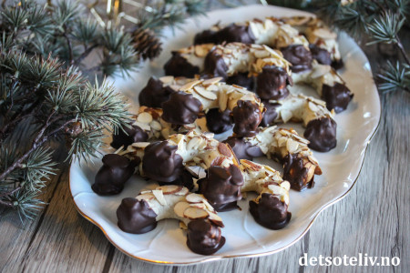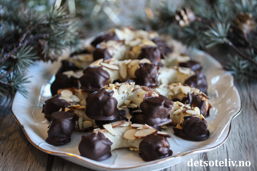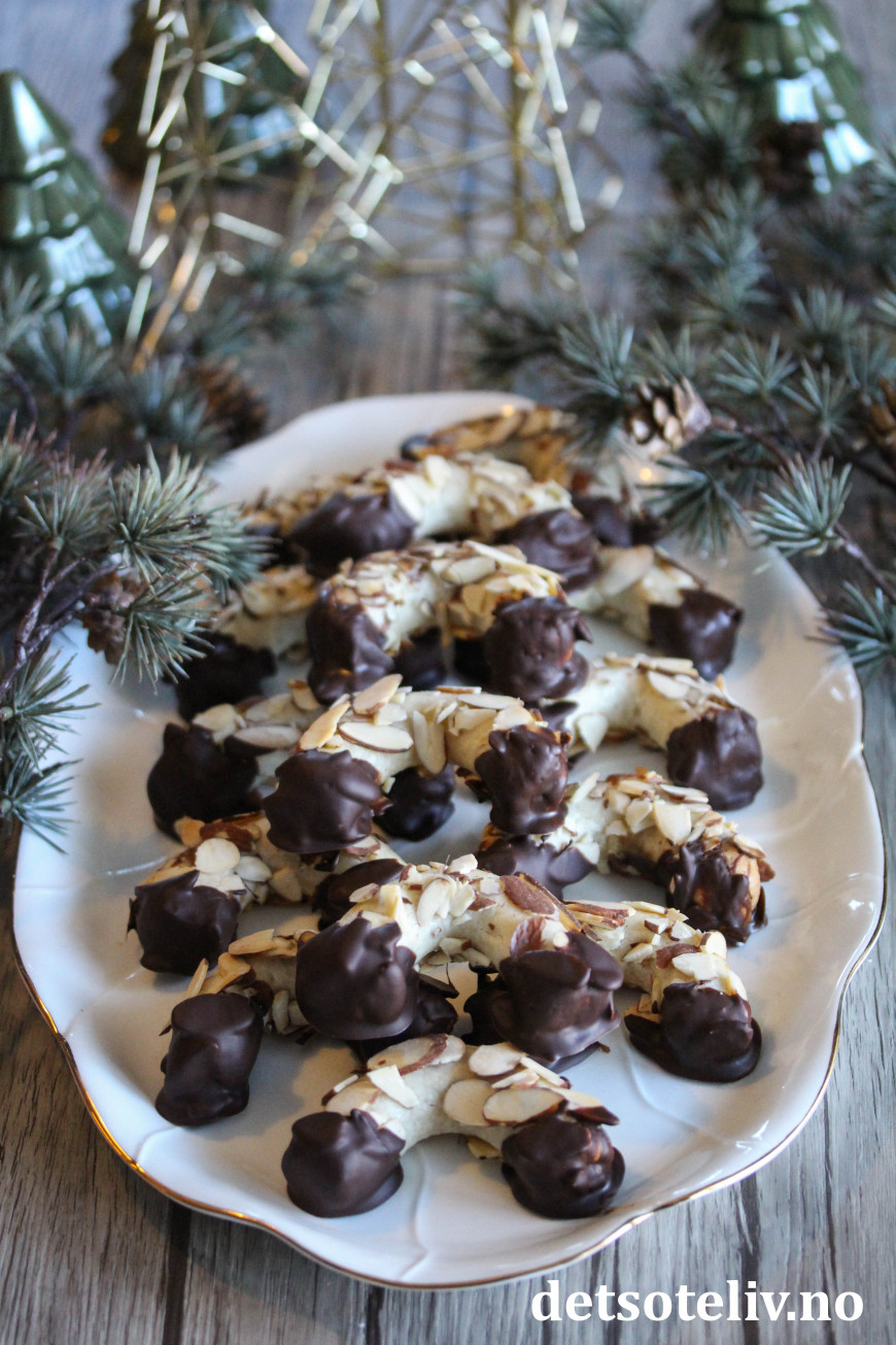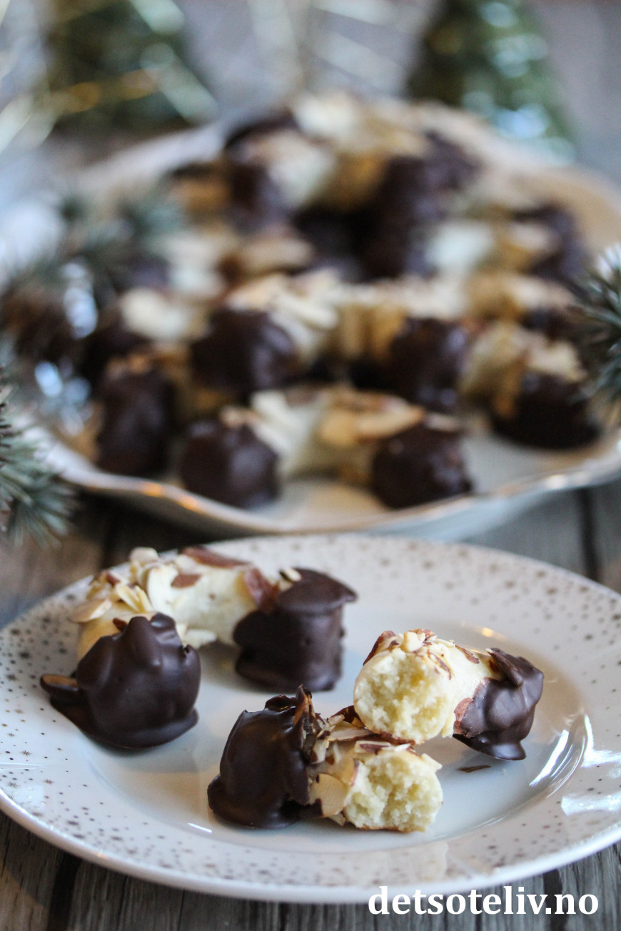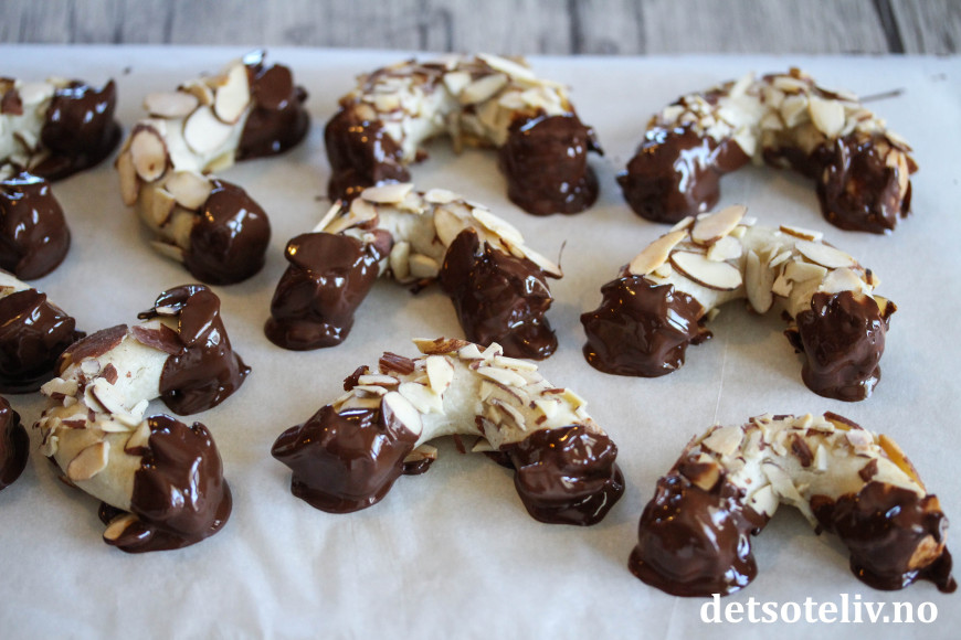 Dypp endene på mandelhornene raskt i sjokoladen og legg dem tilbake på bakepapiret.