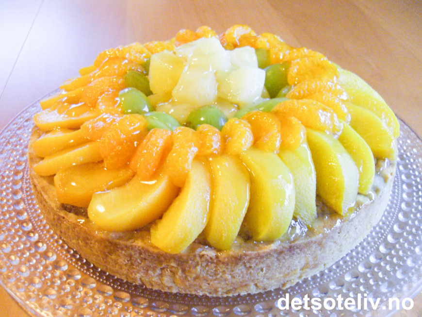 Pynt kaken med hermetisk frukt og druer (se bildet). Smelt eplegeléen i et par sekunder mikro (se tips). Øs den så forsiktig over frukten med en spiseskje slik at alle fruktbitene blir glasert. Sett kaken i kjøleskapet slik at eplegeléen får stivnet.