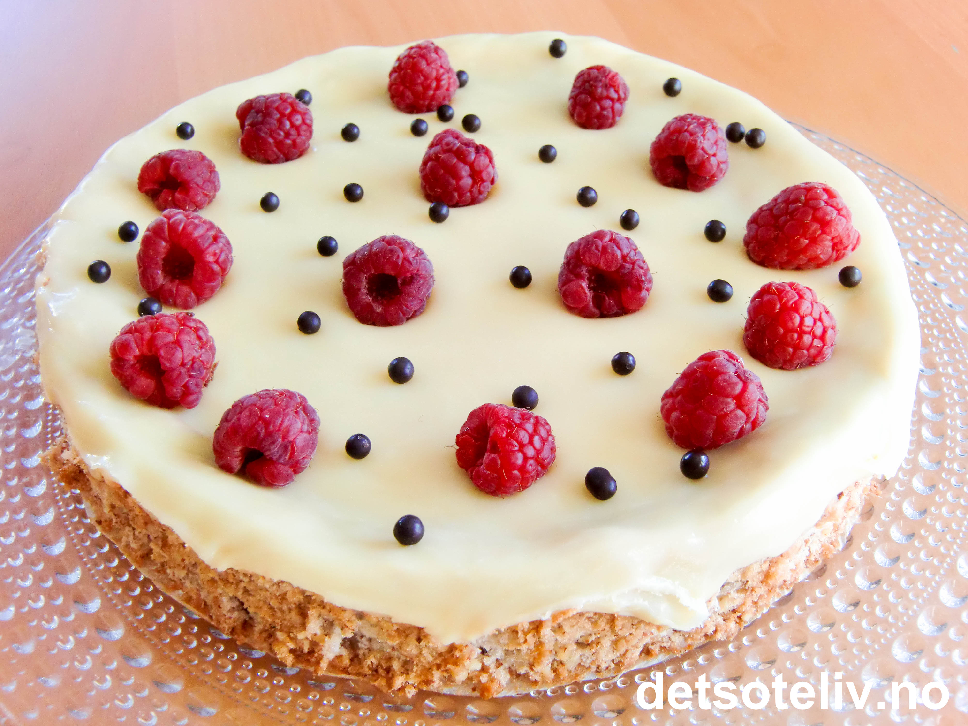 Kok opp fløten i en liten kjele. Ta kjelen av platen og tilsett oppdelt hvit sjokolade. Rør til sjokoladen har smeltet. Avkjøl til passe smørekonsistens og bre glasuren deretter over kaken. Pynt med friske bringebær og litt mørk sjokolade.