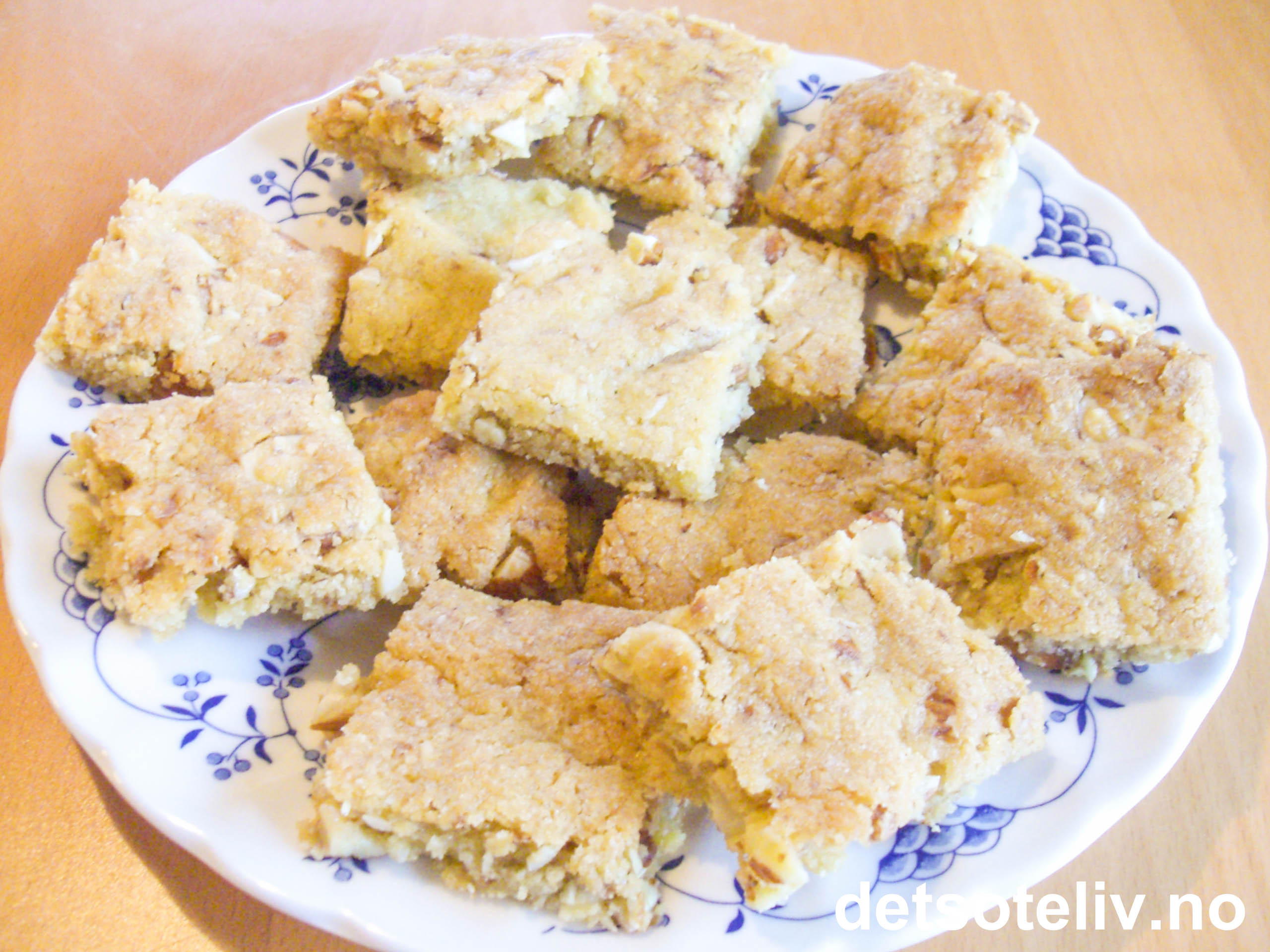 Når hele mørdeigen stekes som en hel kake, slik som i denne oppskriften, vil kaken blir fortere ferdigstekt i kantene enn i midten. Angitt steketid i originaloppskriften er 15 min, men jeg synes ikke at kaken er tilstrekkelig stekt i midten etter så kort tid. Jeg tar derfor ut kaken etter 15 min og skjærer bare ytterkanten opp i firkanter og legger dem deretter på rist. Så steker jeg midten av kaken videre til også den er gylden og kjennes gjennomstekt.