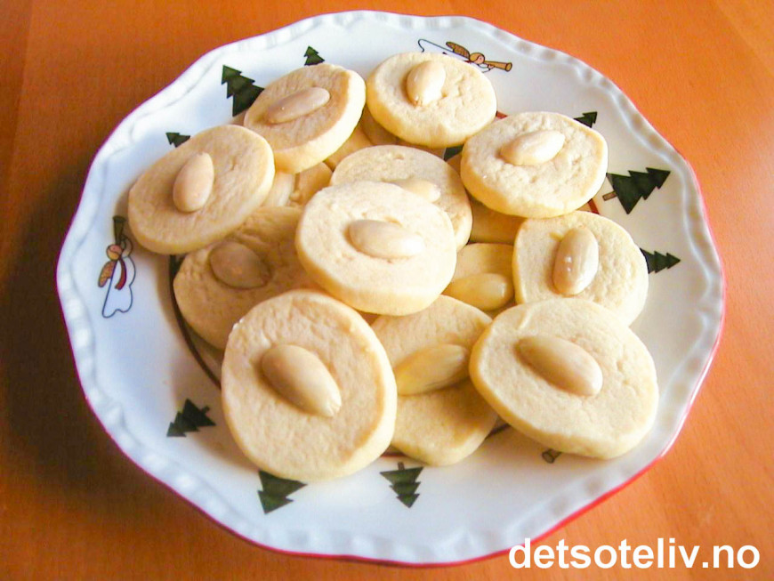 Form deigen til pølser som er ca 4 cm i diameter. Sett pølsene i kjøleskapet til de har stivnet litt. Skjær pølsene i skiver. Trykk en skåldet mandel, som er penslet litt med eggehvite på undersiden, godt ned i midten på hver kake.