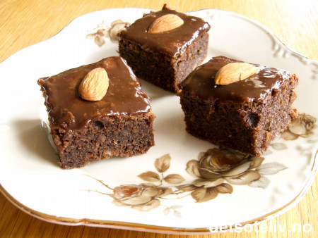 Smelt smøret i en kjele. Ta kjelen av platen og tilsett oppdelt sjokolade. La sjokoladen smelte i det varme smøret. Pisk eggene og sukkeret lett sammen med en stålvisp. Bland i sjokoladesmøret. Mal mandlene og ha i sammen med hvetemel.