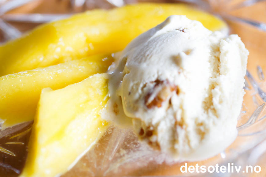 Men nå er jeg altså hjemme i Oslo igjen og er veldig klar for å lage nye kaker og desserter til dere som følger Det søte liv. Jeg er spesielt fornøyd med at jeg nå har utvidet bloggen til inkludere desserter i tillegg til kaker og jeg starter opp igjen i dag med en superduperenkel dessert laget av mango, rom og vaniljeis. Utrolig enkelt, men veldig deilige smaker nå i sommervarmen.