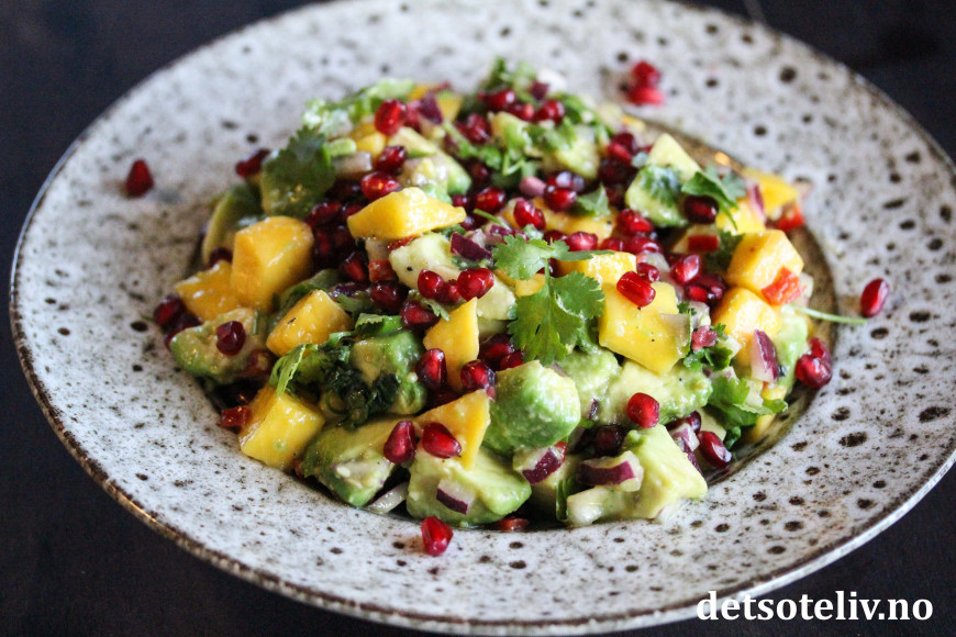 Mango- og avokadosalat med rødløk, chili, koriander og granateplekjerner er skikkelig friskt, fargerikt og smakfullt tilbehør til mange slags retter.