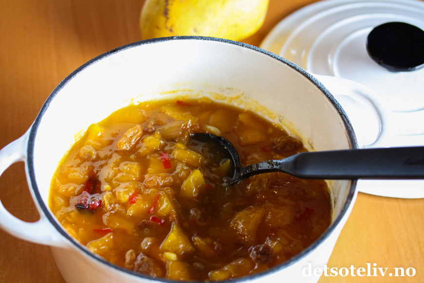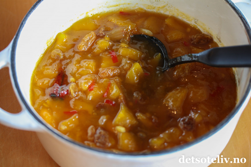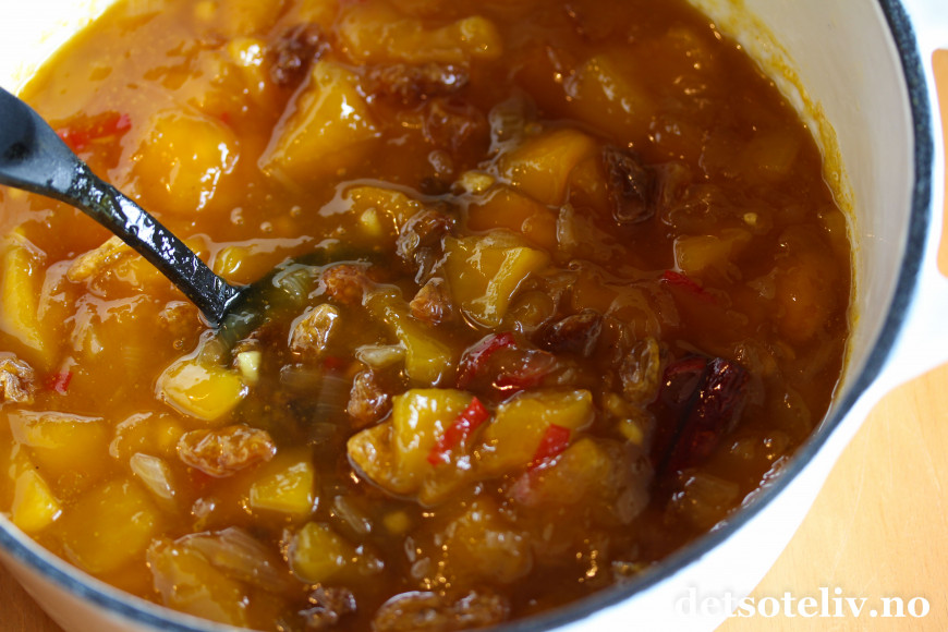 Når chutneyen er ferdig, vil mangoen ha blitt helt mør - noen biter vil ha løst seg opp, men det skal også fortsatt være noen mangobiter igjen.