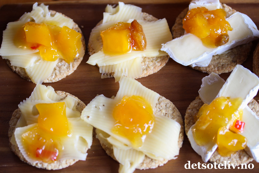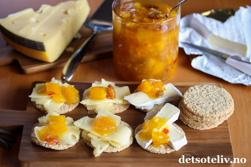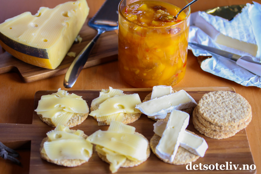 ♥ Mango chutney smaker utrolig godt til gulost og hvitskimmelsost. Her har jeg servert chutneyen sammen med havrekjeks dekket med vellagret Sveitser og Brie. NAM!