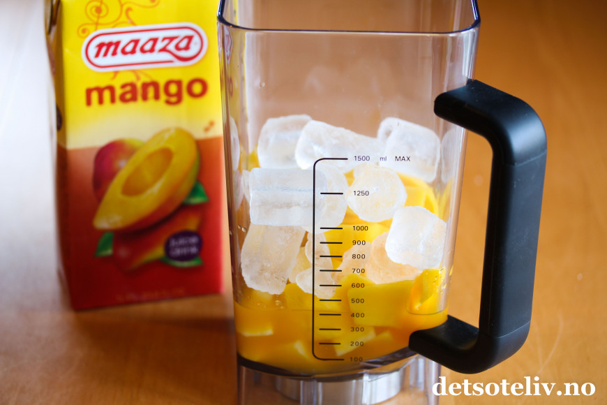 Og her er den: Du trenger bare mango, mangojuice, isbiter - og en skikkelig god blender som kan knuse isbiter - for å lage verdens deiligste mangosmoothie!