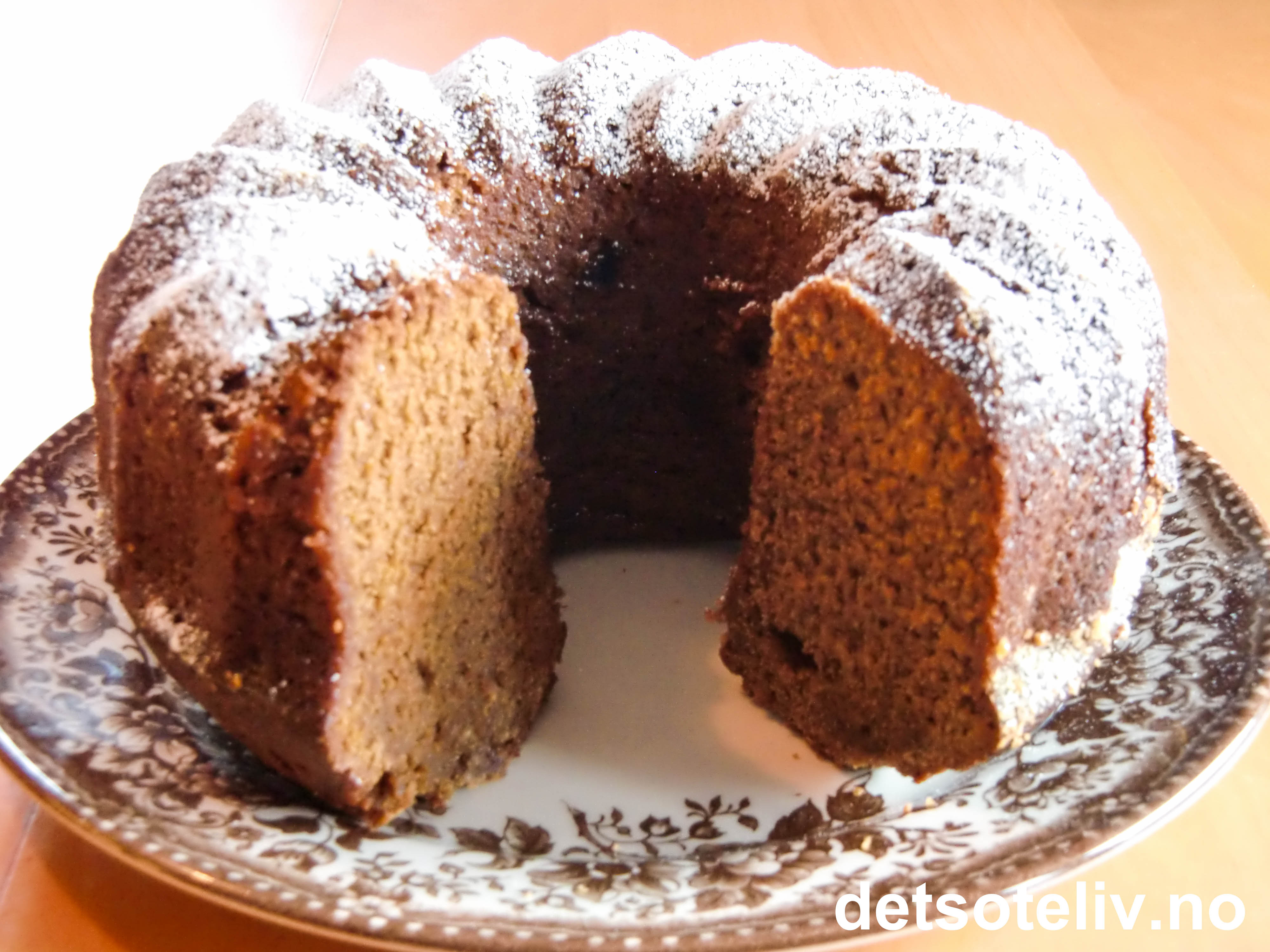 Ha deigen i en smurt og strødd formkakeform (se tips). Stek kaken midt i ovnen ved 180°C i ca 50 min (sjekk med kakenål at kaken er gjennomstekt). La kaken avkjøles litt i formen før den forsiktig hvelves over på et fat.
