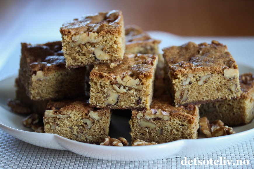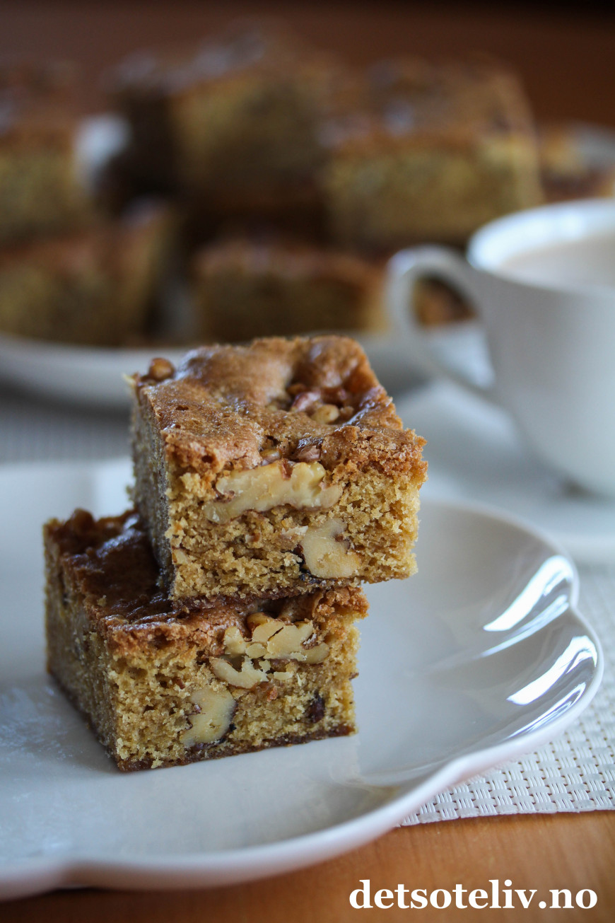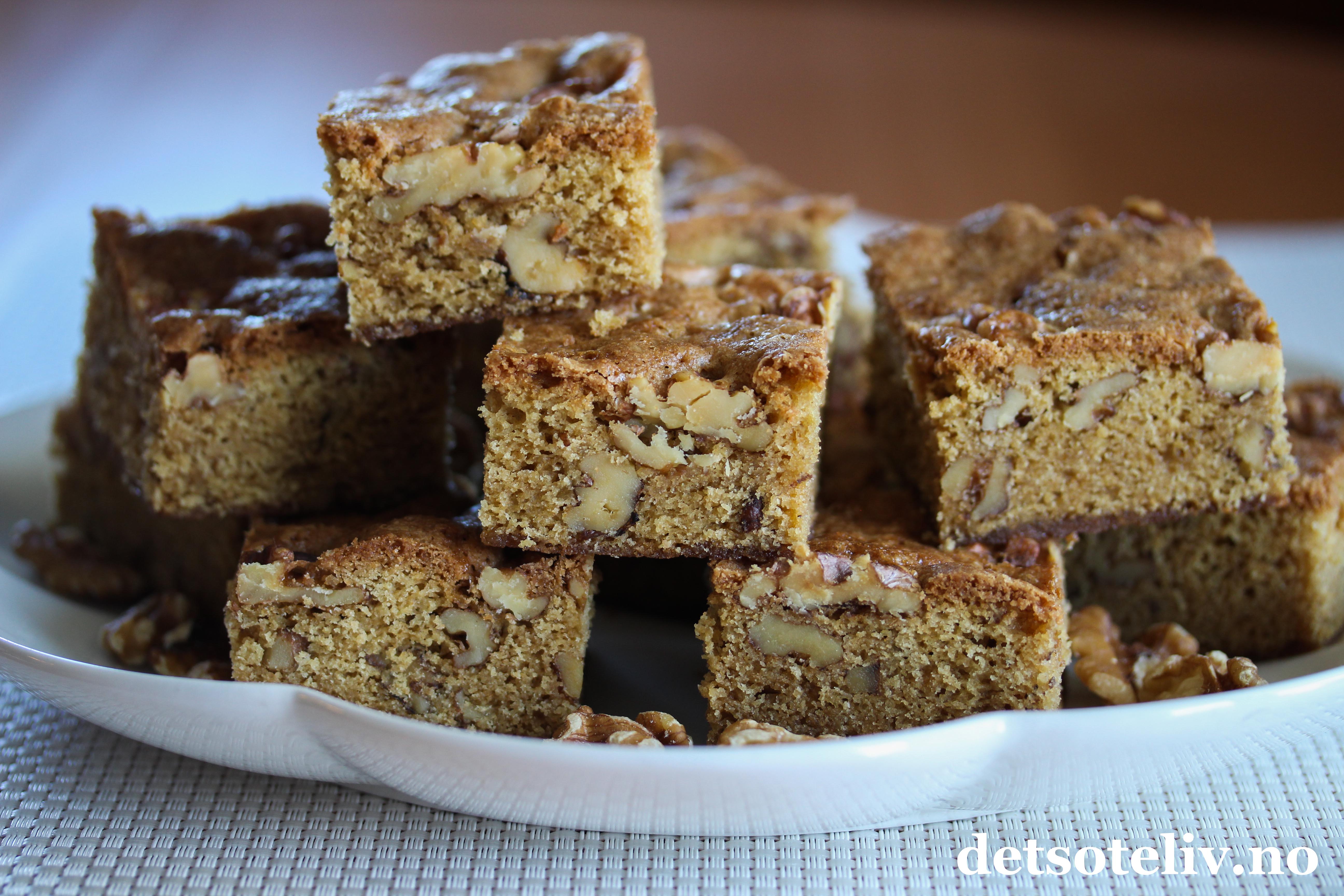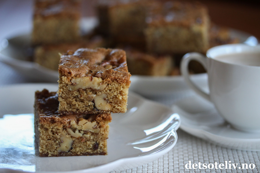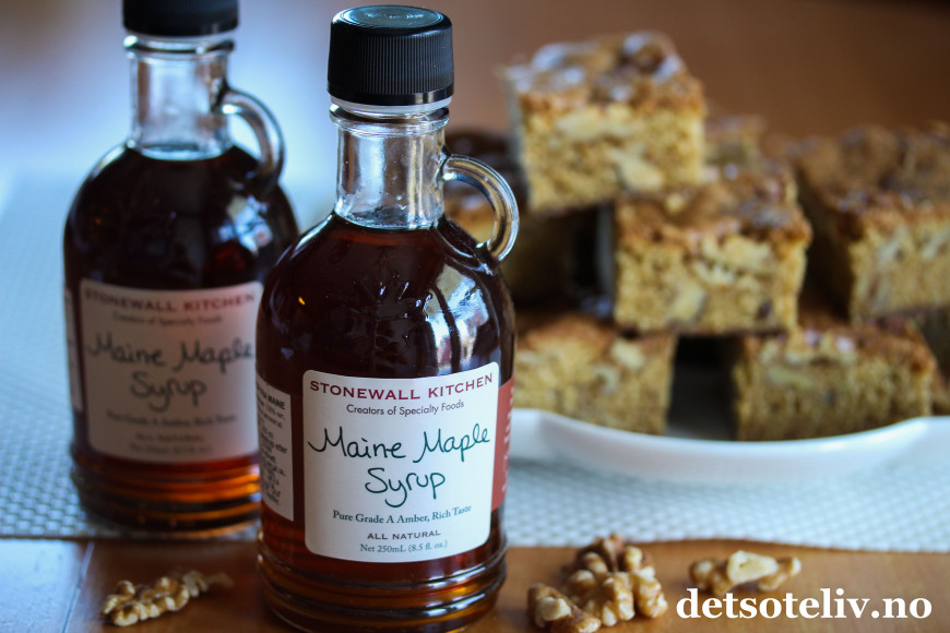 Dette er amerikanske brownies som ikke inneholder sjokolade, og som derfor også ofte kalles for "Blondies" (se en litt annen variant av Blondies som jeg har publisert tidligere her på Det søte liv). Denne varianten lages med brunt sukker, ekte lønnesirup (amerikansk Maple Syrup fra Stonewall Kitchen) og valnøtter. En vidunderlig god smakskombinasjon!