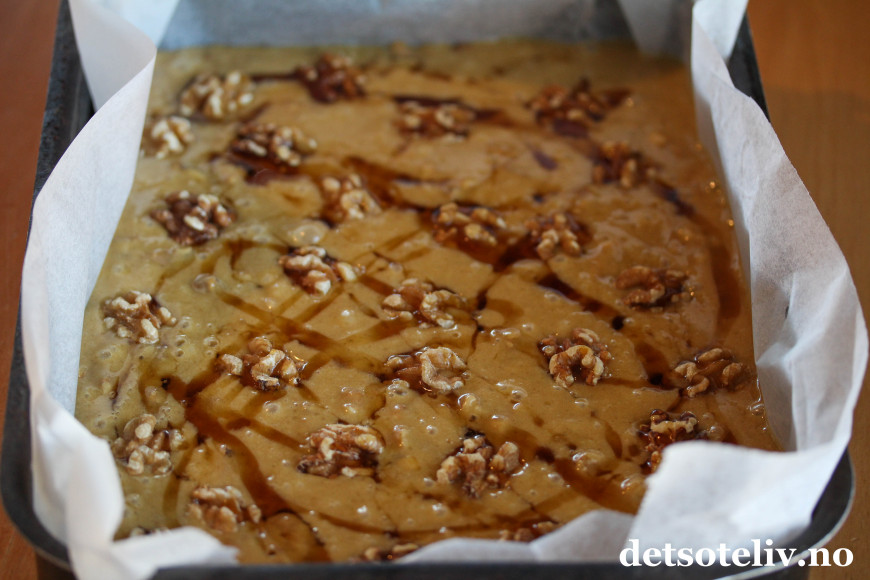 Ha deigen i en liten, bakepapirkledd langpanne (ca. 20 x 30 cm).