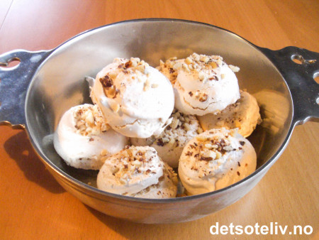 Sett topper på bakepapirkledd stekeplate med to spiseskjeer. Dryss over fint hakkede nøtter.