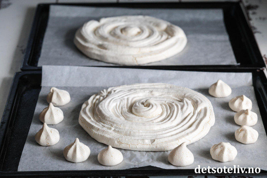 Ha marengsbunnene i en ovn som er oppvarmet til 225°C (se tips). Slå straks ned varmen til 50°C (med ovnen innstilt på varmluftsfunksjon). Stek marengsbunnene i ca. 40 minutter. Slå av varmen helt og la marengsbunnene stå og tørke i ovnen til ovnen har blitt helt kald.