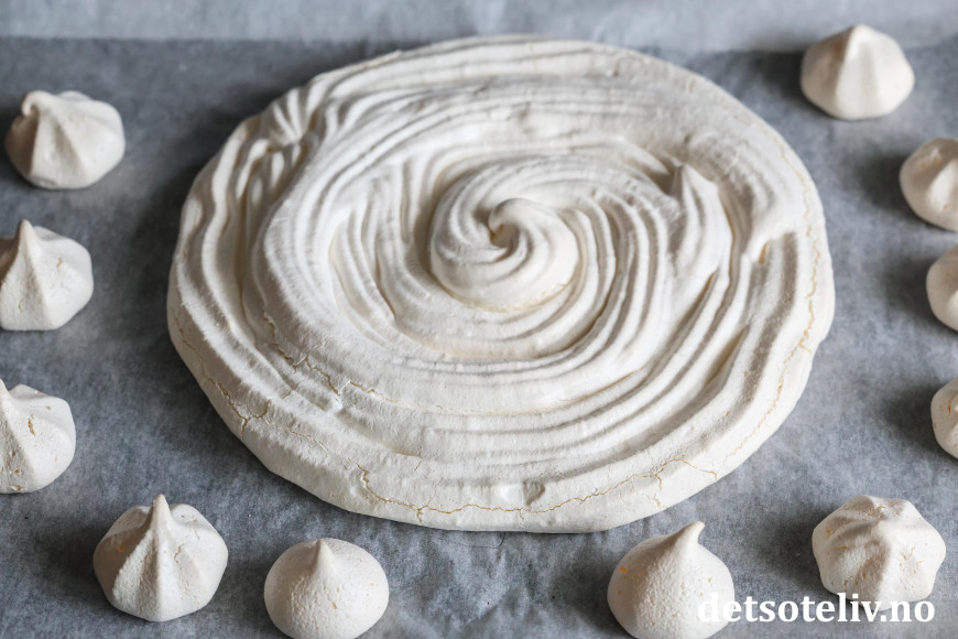 Løsne marengsbunnene og pikekyssene forsiktig fra bakepapiret.