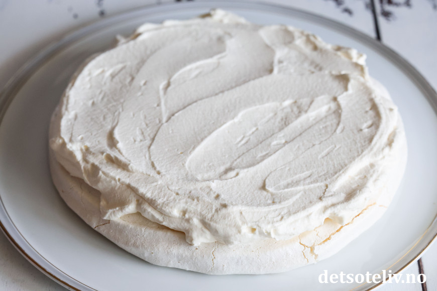 Ha bakepapir på to stekeplater. Tegn en sirkel på hvert stykke papir som er 22 cm i diameter. Sprøyt marengsmassen innenfor sirklene slik at du får to marengsbunner. Bruk restene av marengsen til å sette pikekyss på bakepapiret rundt sirklene.
